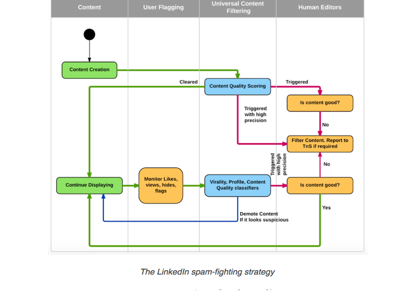 Powyżej znajduje się zdjęcie oficjalnej informacji przekazanej przez LI w kontekście algorytmu. To, na co szczególnie warto zwrócić uwagę, to fakt, że algorytm nie działa liniowo, lecz tworzy cykle w pętlach. Dlatego całkowite próby przewidywania, jak w ekosystemie LI zachowa się opublikowana przez nas treść, są obarczone błędem. Prawdopodobnie z tego powodu jednym z elementów algorytmu jest sprawdzanie przez człowieka, co wyróżnia go od EdgeRanka – ale o tym w dalszej części tekstu.